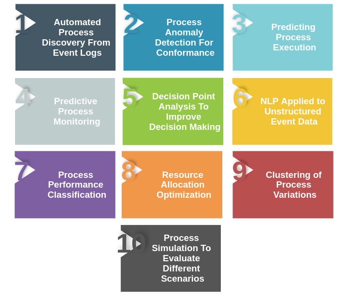 In order to extract relevant and actionable information from event logs, sophisticated data analysis approaches are required. Artificial intelligence (AI) therefore plays a key role in process mining. The following is an illustration of ten use cases of AI in process mining: